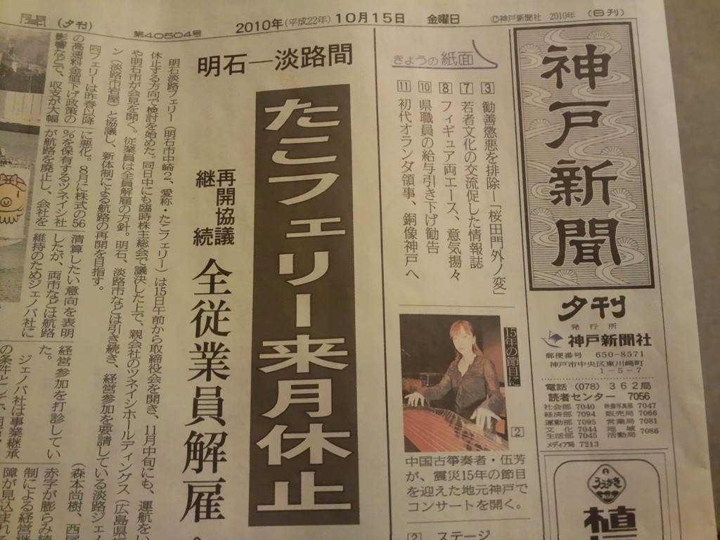 2010-10-15 明石のたこフェリーが・・・・・ 日々のこと その他のこと 以前から経営危機が伝えられていましたがついに一時休止になる模様です淡路ジェノバラインが行政から事業継承を打診されていますが難航しているのかもしれませんこの航路が無くなると126CC以上のバイクしか淡路島ツーリングへ行けなくなるかも!?